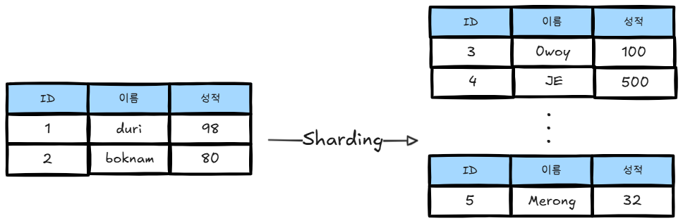 하나의 DB 테이블을 여러 개의 작은 조각 (Shard)로 나누어 여러 서버에 분산 저장하는 기술