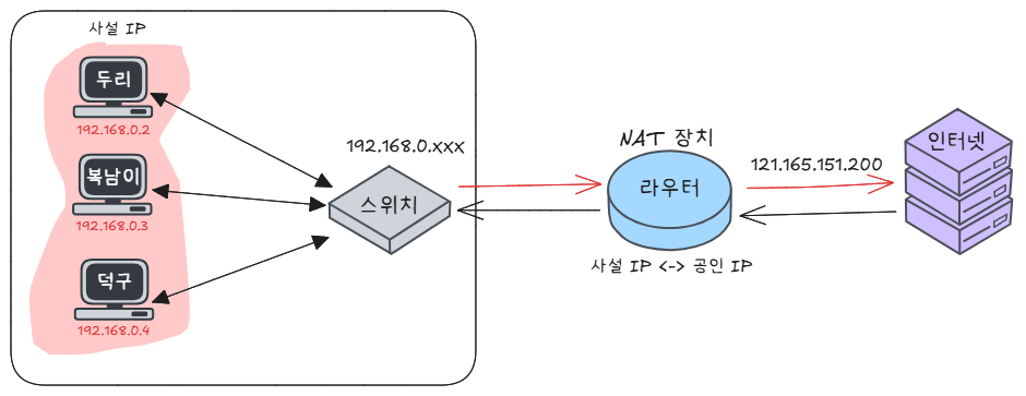 - 두리, 복남이, 덕구는 `192.168.0.xxx`를 기반으로 각각의 다른 IP 소유 = 사설 IP