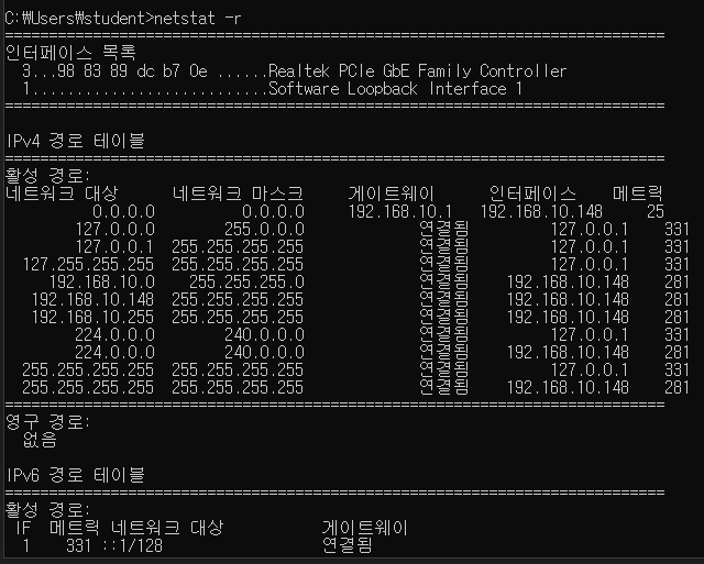 윈도우에서는 명령 프롬프트에서 `netstat -r` 명령어 실행하여 확인