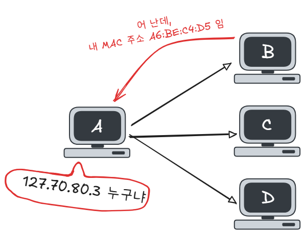- 장치 A가 ARP Request 브로드캐스트를 보내서 IP 주소인 `127.70.80.3`에 해당하는 MAC 주소 찾음