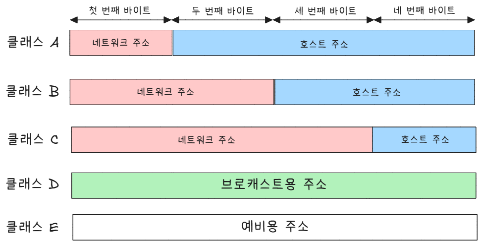 IP 주소 체계는 발전해오고 있으며 처음에는 A, B, C, D, E 다섯 개의 클래스로 구분하는 클래스 기반 할당방식 사용